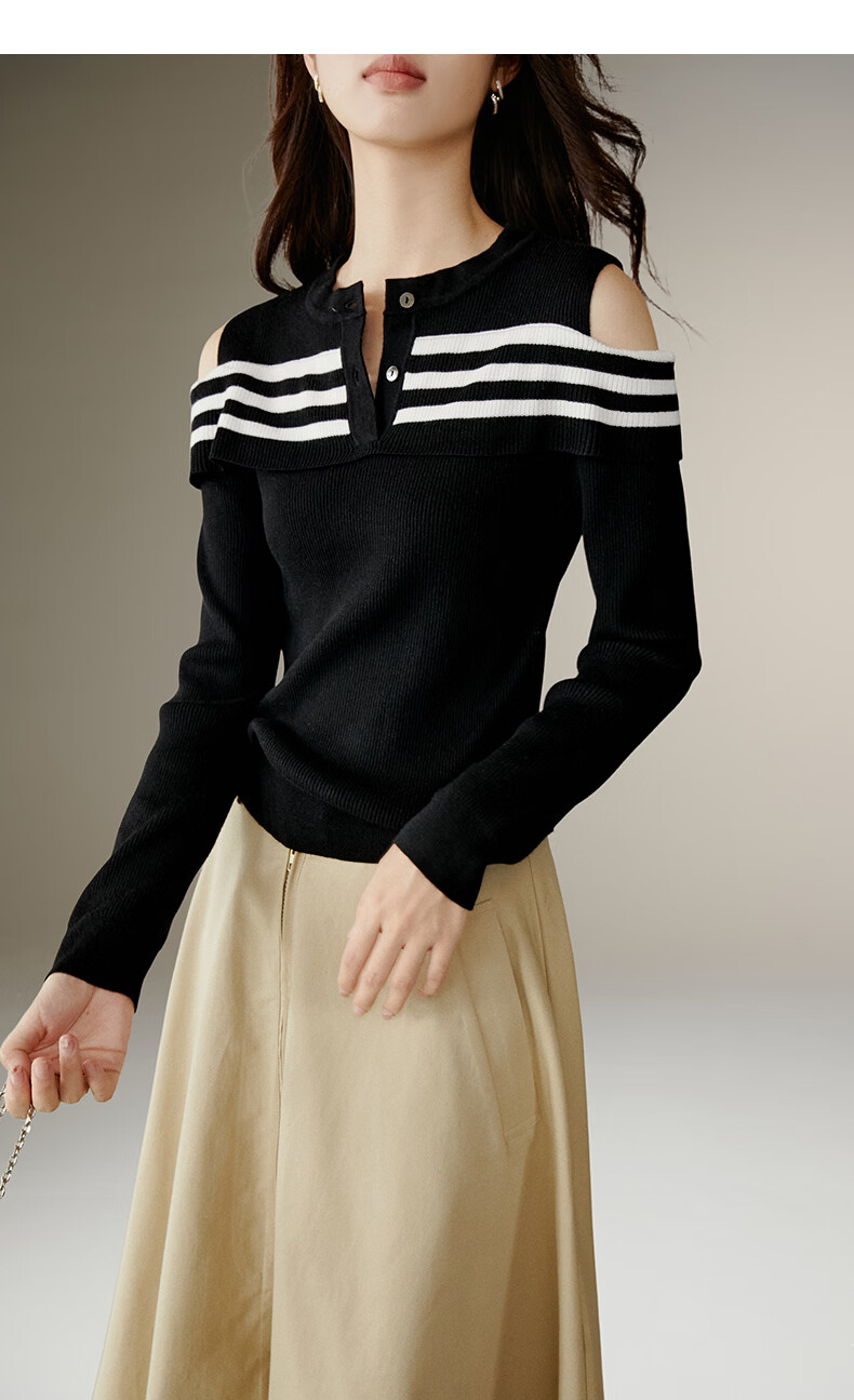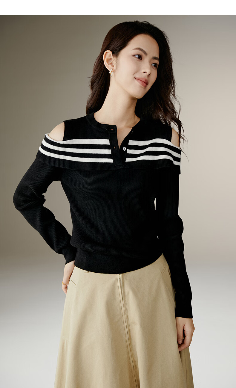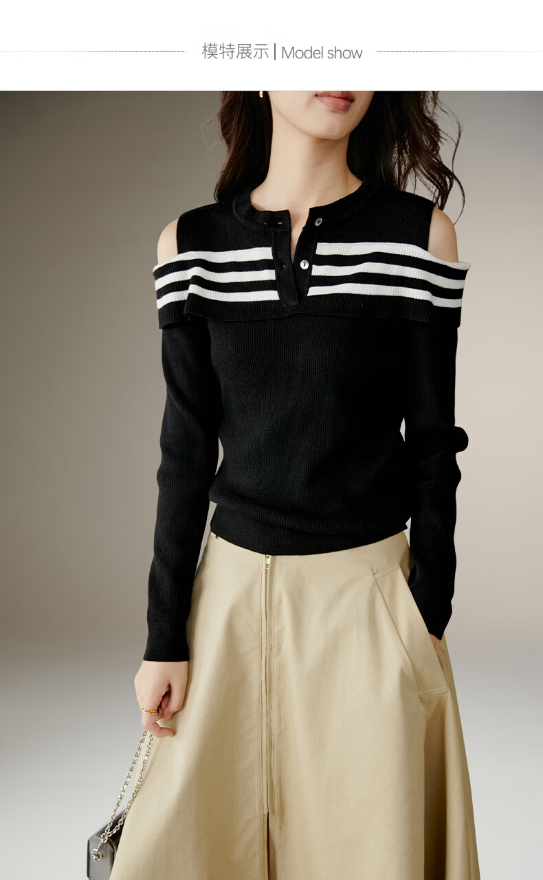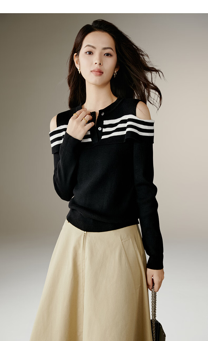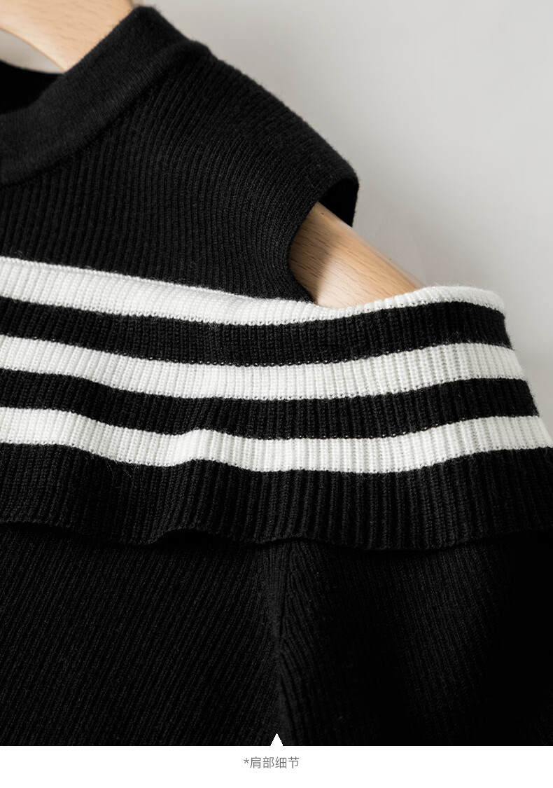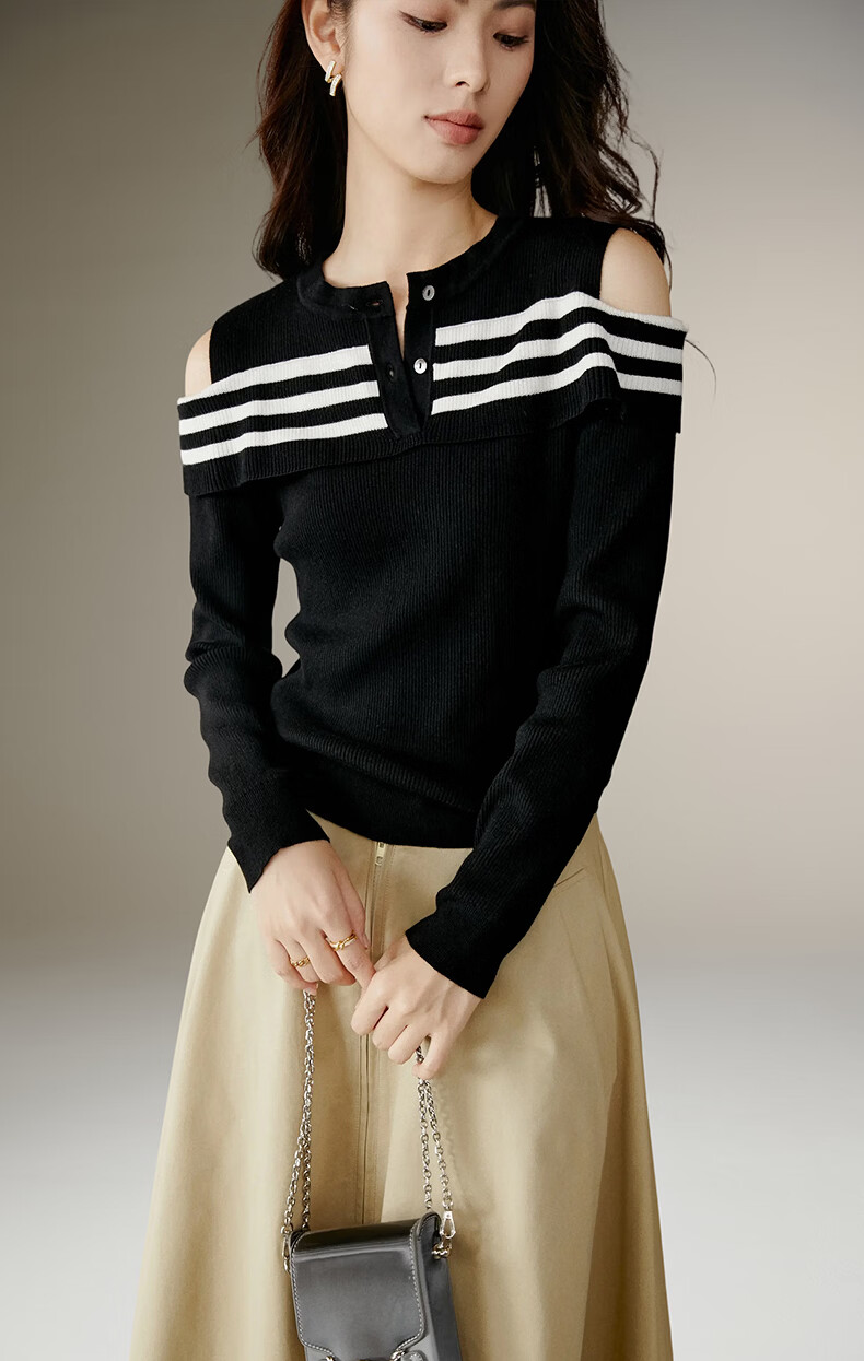 晚白【新品】2026年春款时尚条纹撞色露肩毛衣含羊毛柔软舒适针织衫女 黑色 S